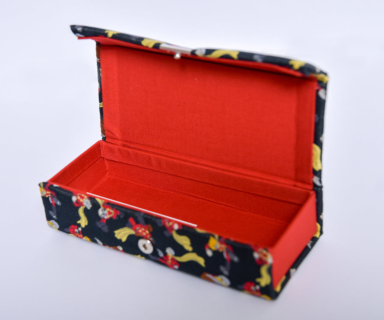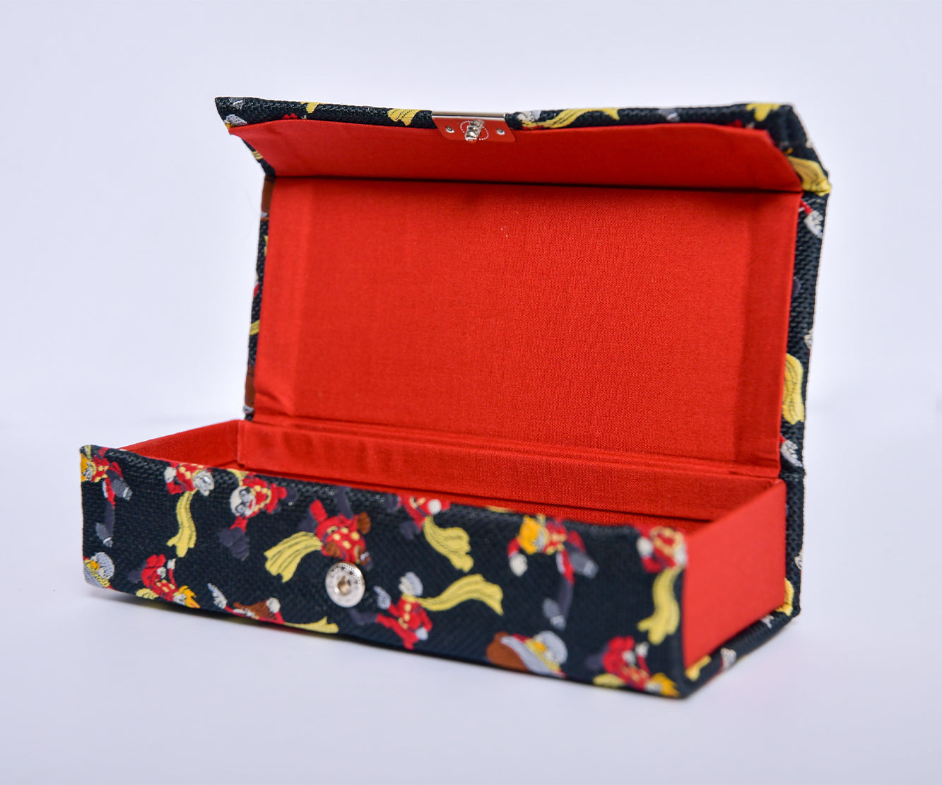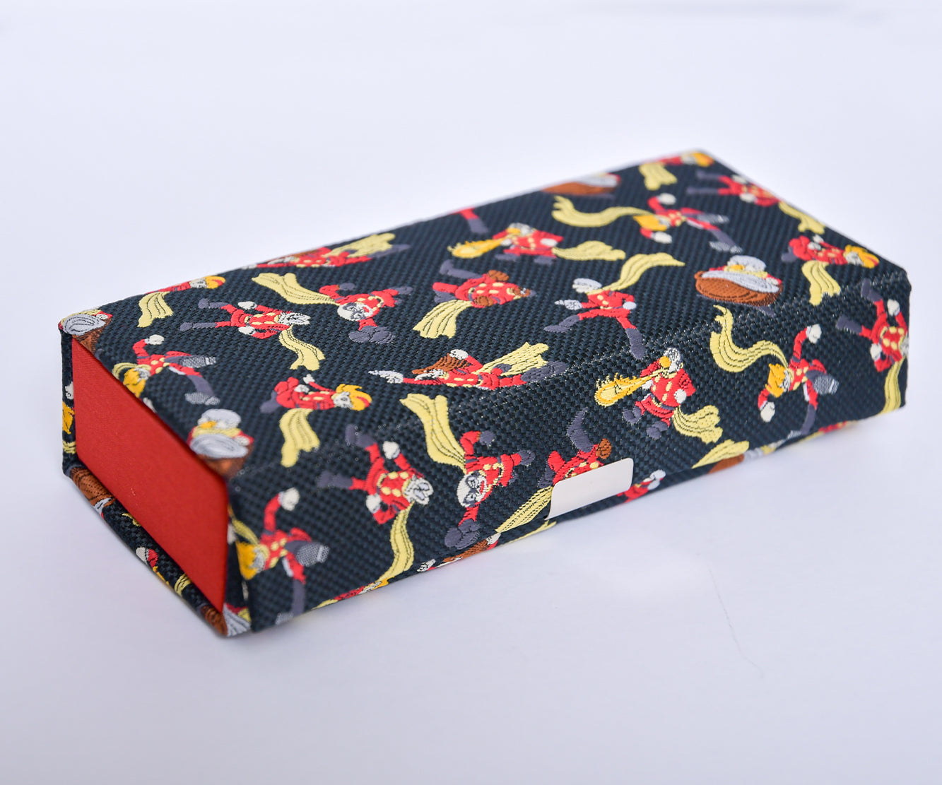 キャラクターのデザインをネクタイ織機を使用したジャカード生地で表現し、眼鏡ケースに仕上げています。