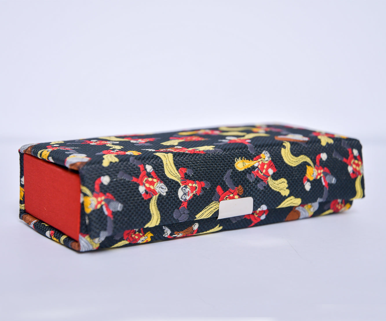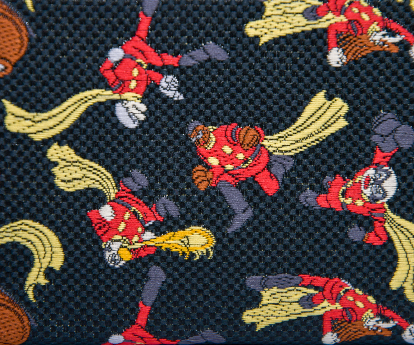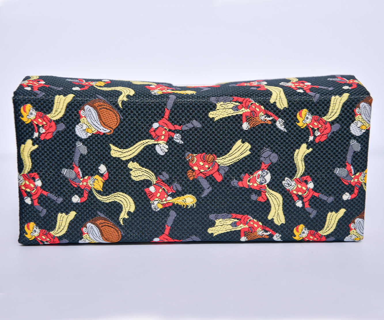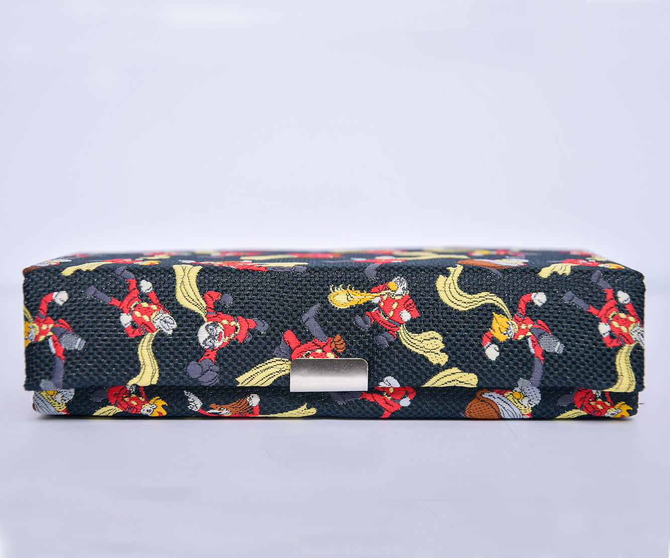 キャラクターのデザインをネクタイ織機を使用したジャカード生地で表現し、眼鏡ケースに仕上げています。