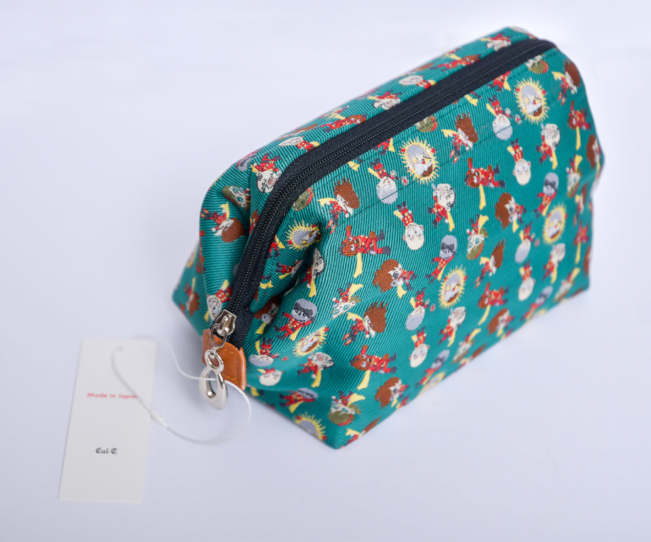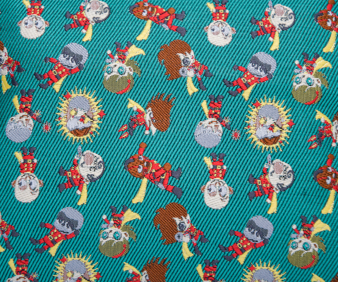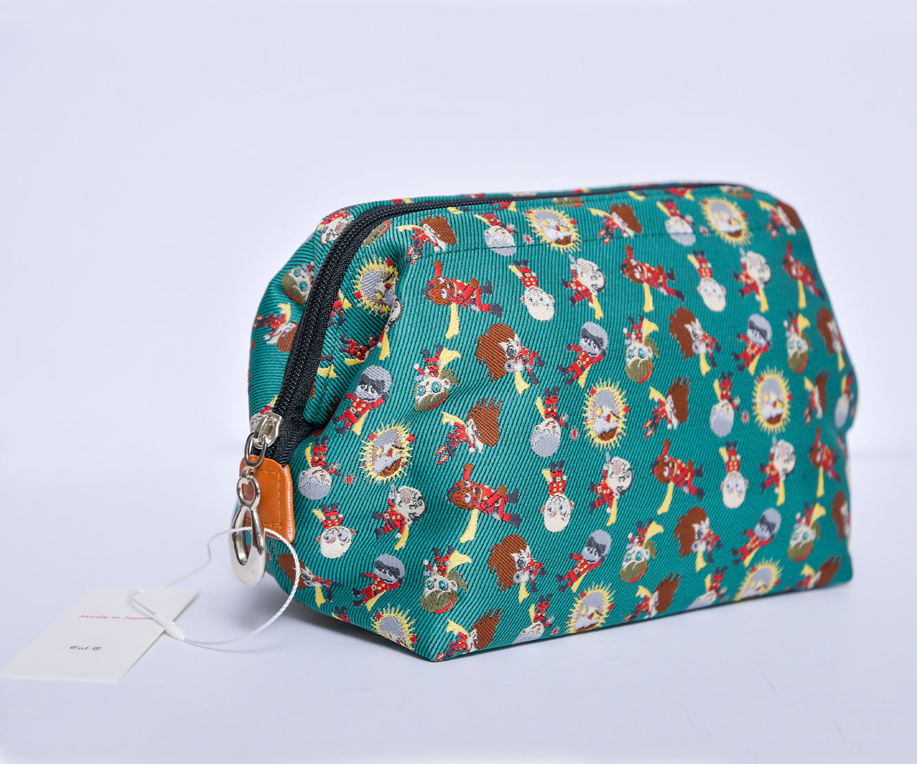 キャラクターのデザインをネクタイ織機を使用したジャカード生地で表現し、ポーチに仕上げています。