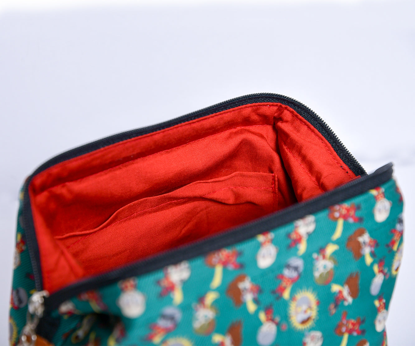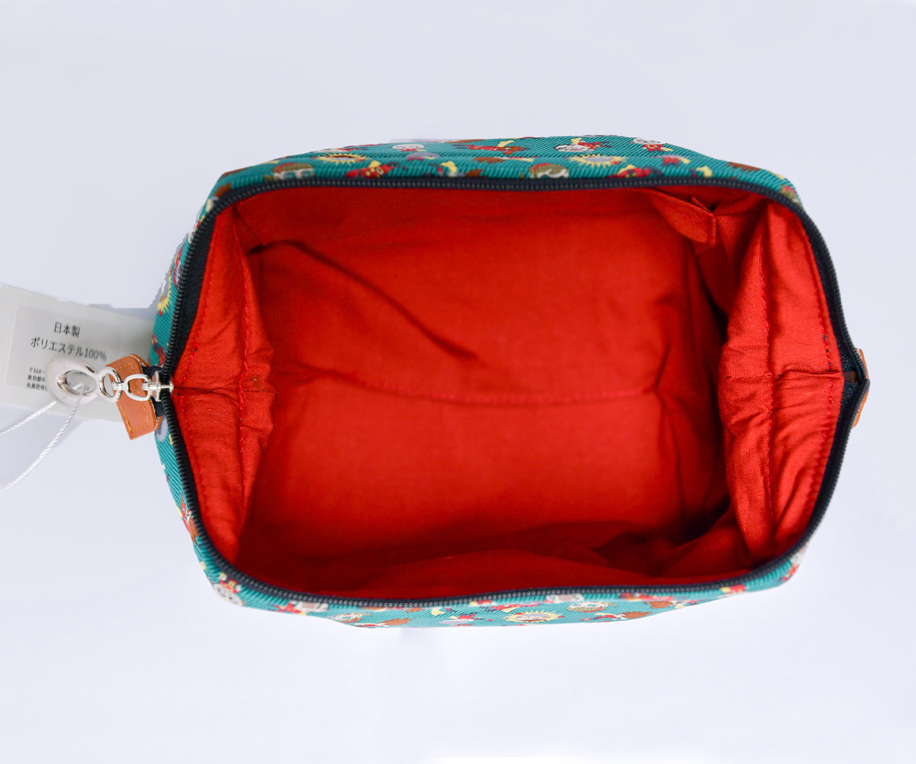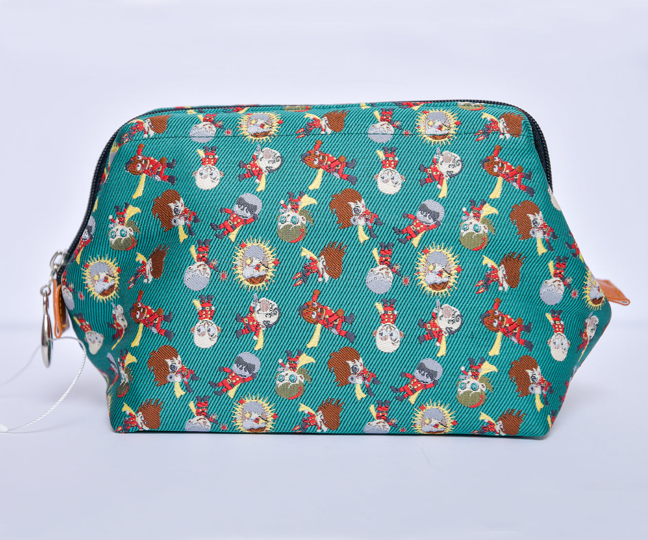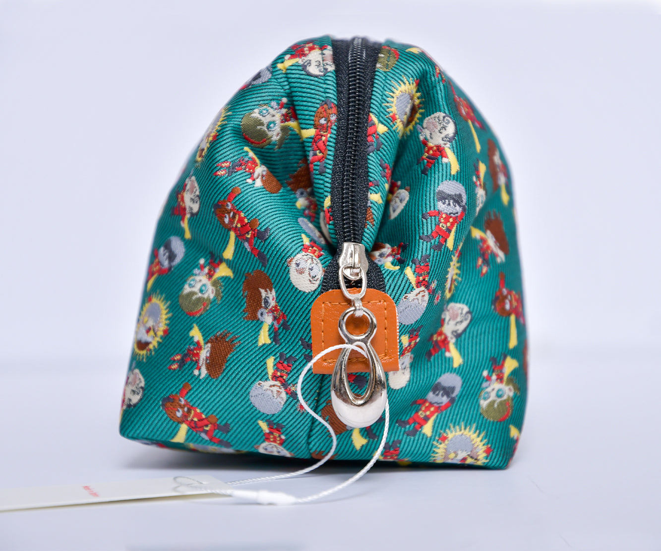 キャラクターのデザインをネクタイ織機を使用したジャカード生地で表現し、ポーチに仕上げています。