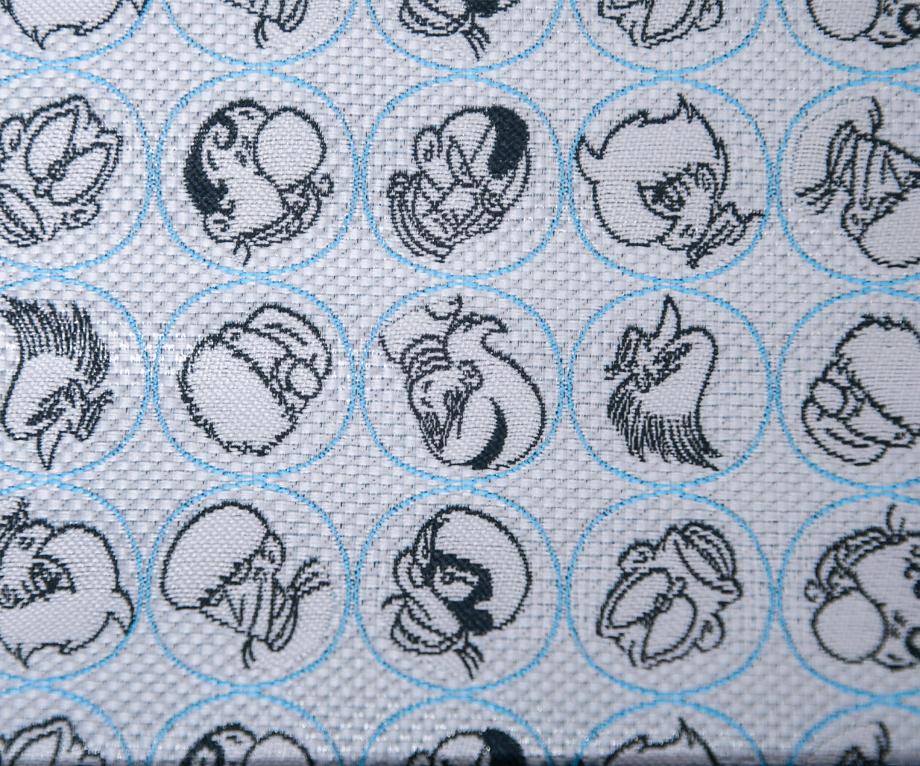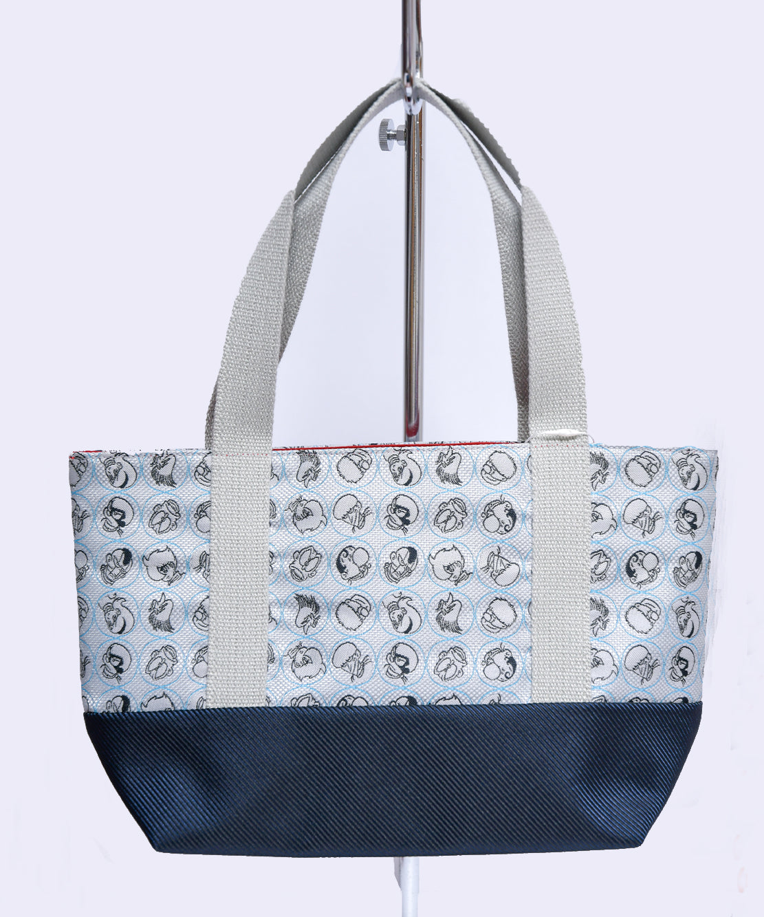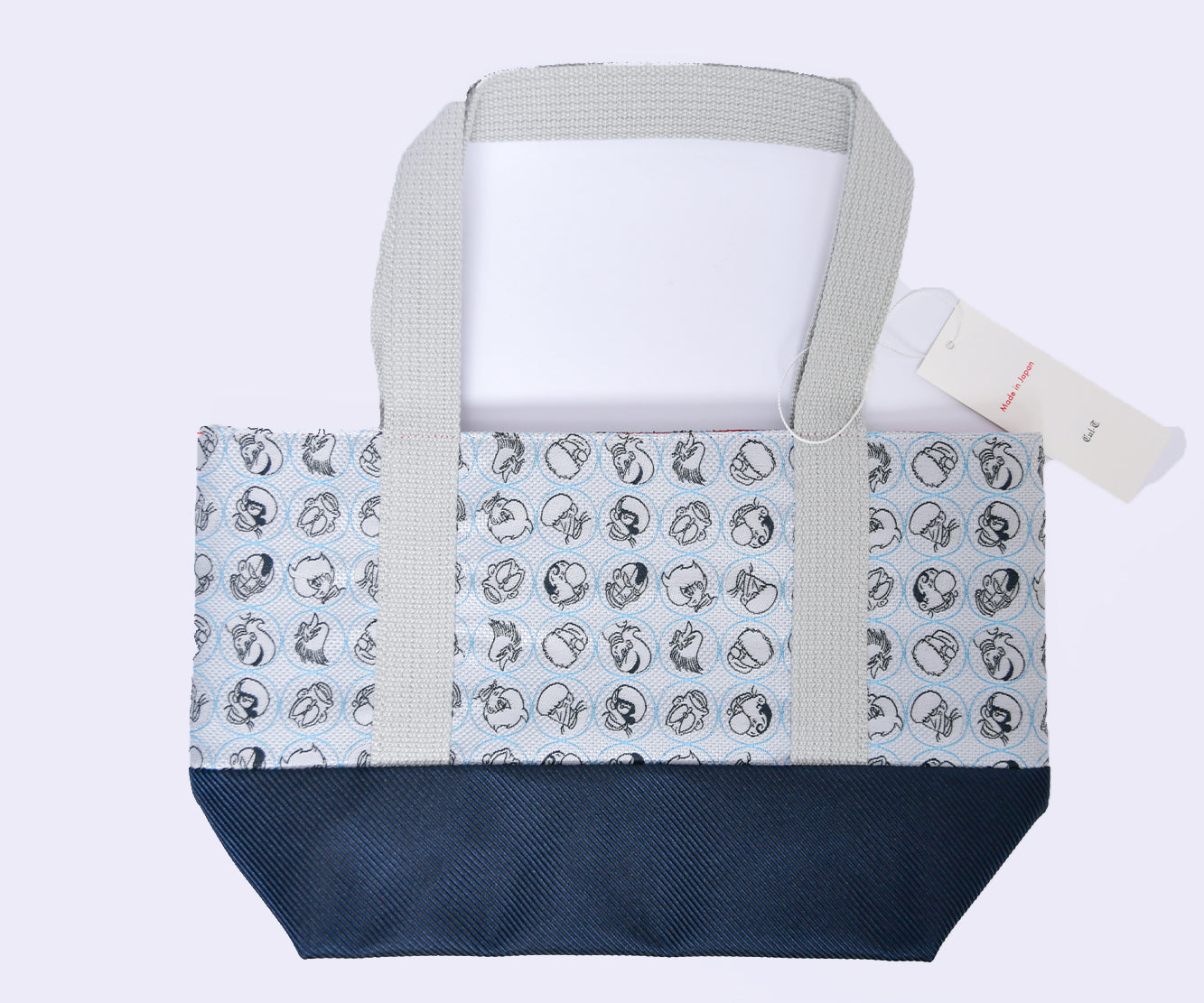 キャラクターのデザインをネクタイ織機を使用したジャカード生地で表現し、ミニトートバッグに仕上げています。