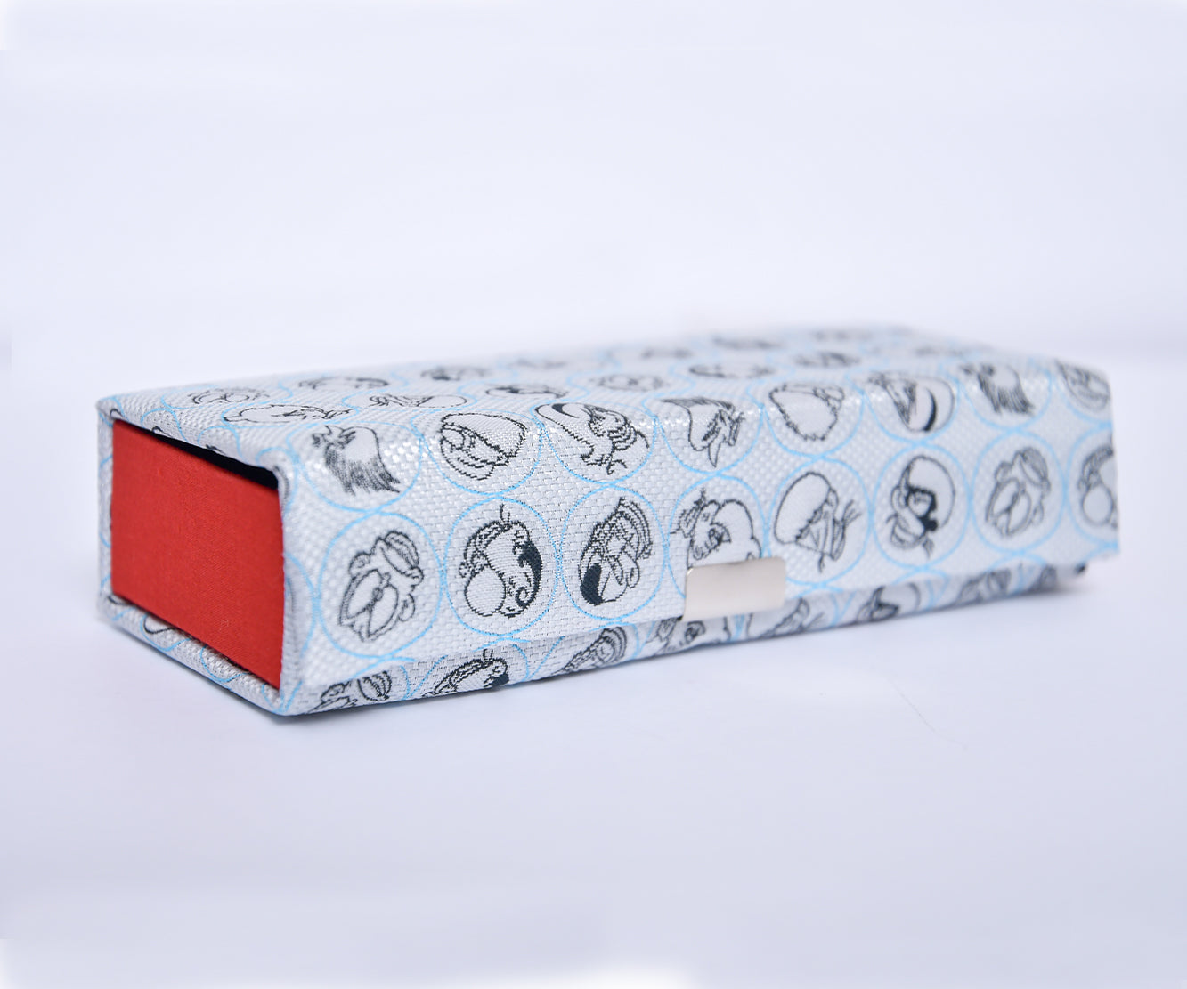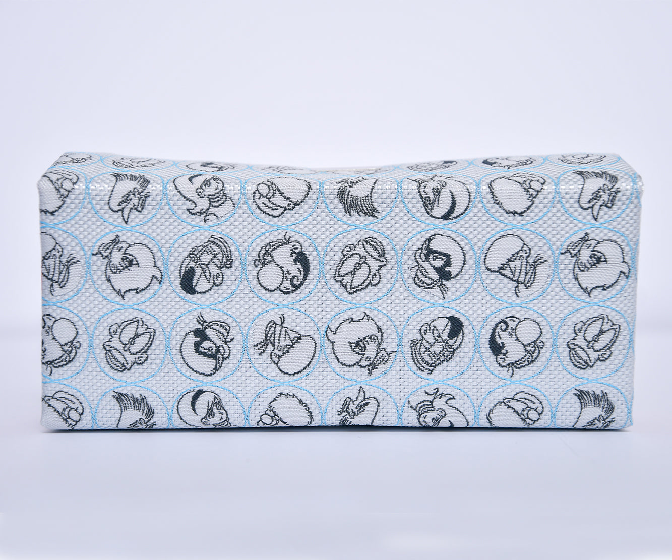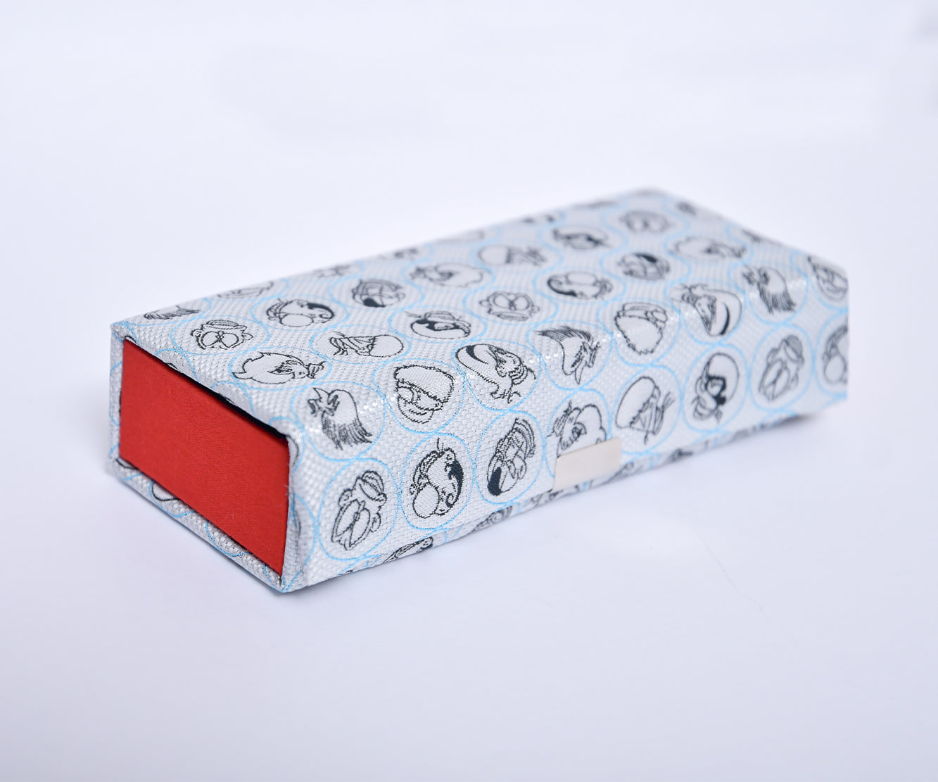 キャラクターのデザインをネクタイ織機を使用したジャカード生地で表現し、眼鏡ケースに仕上げています。