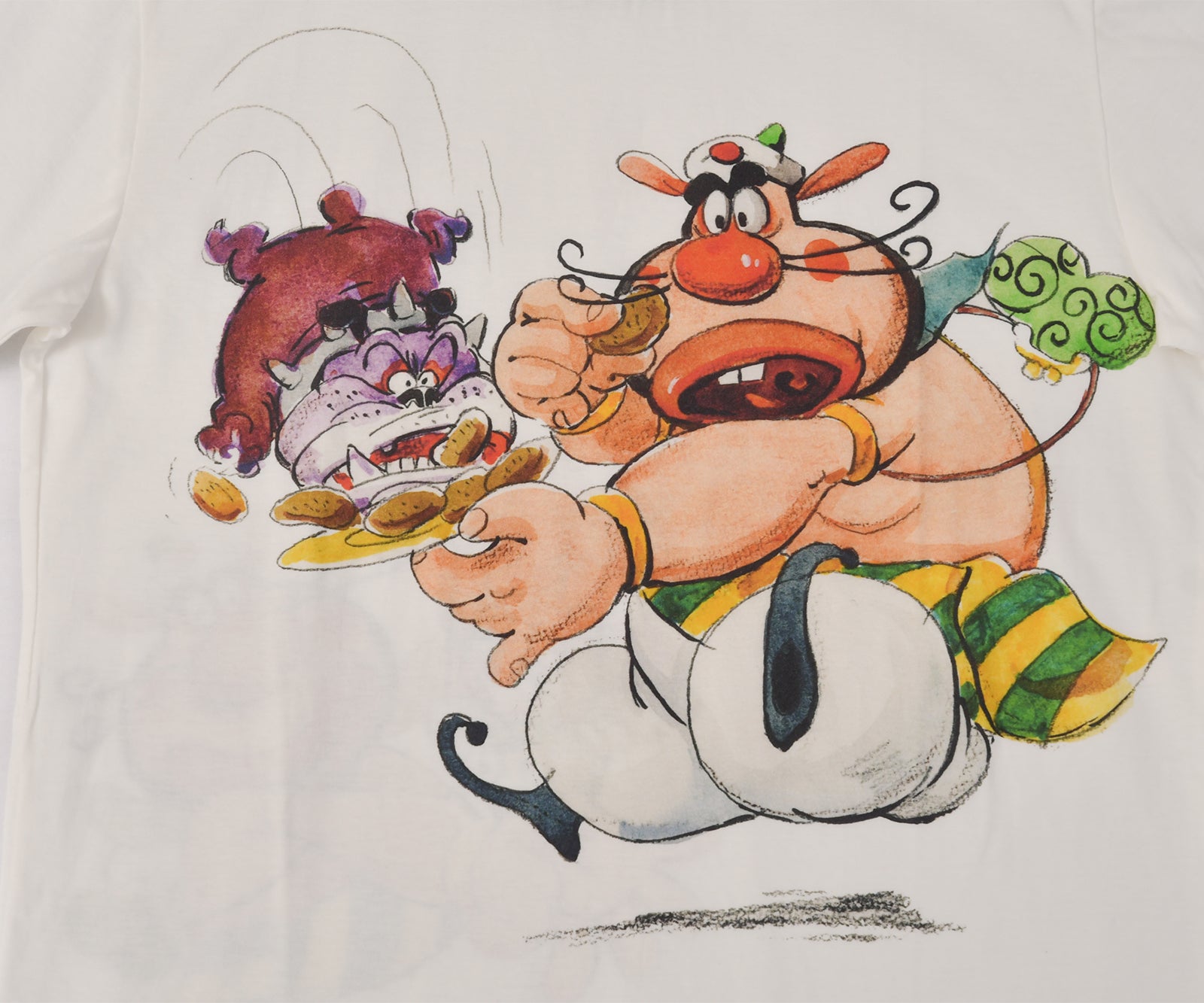 鉛筆画の様なやさしいタッチが特徴的な1枚。背裏(首元の裏)には作品タイトルのロゴがプリントされており、脱いだ時に見える細部もこだわりのポイントです。