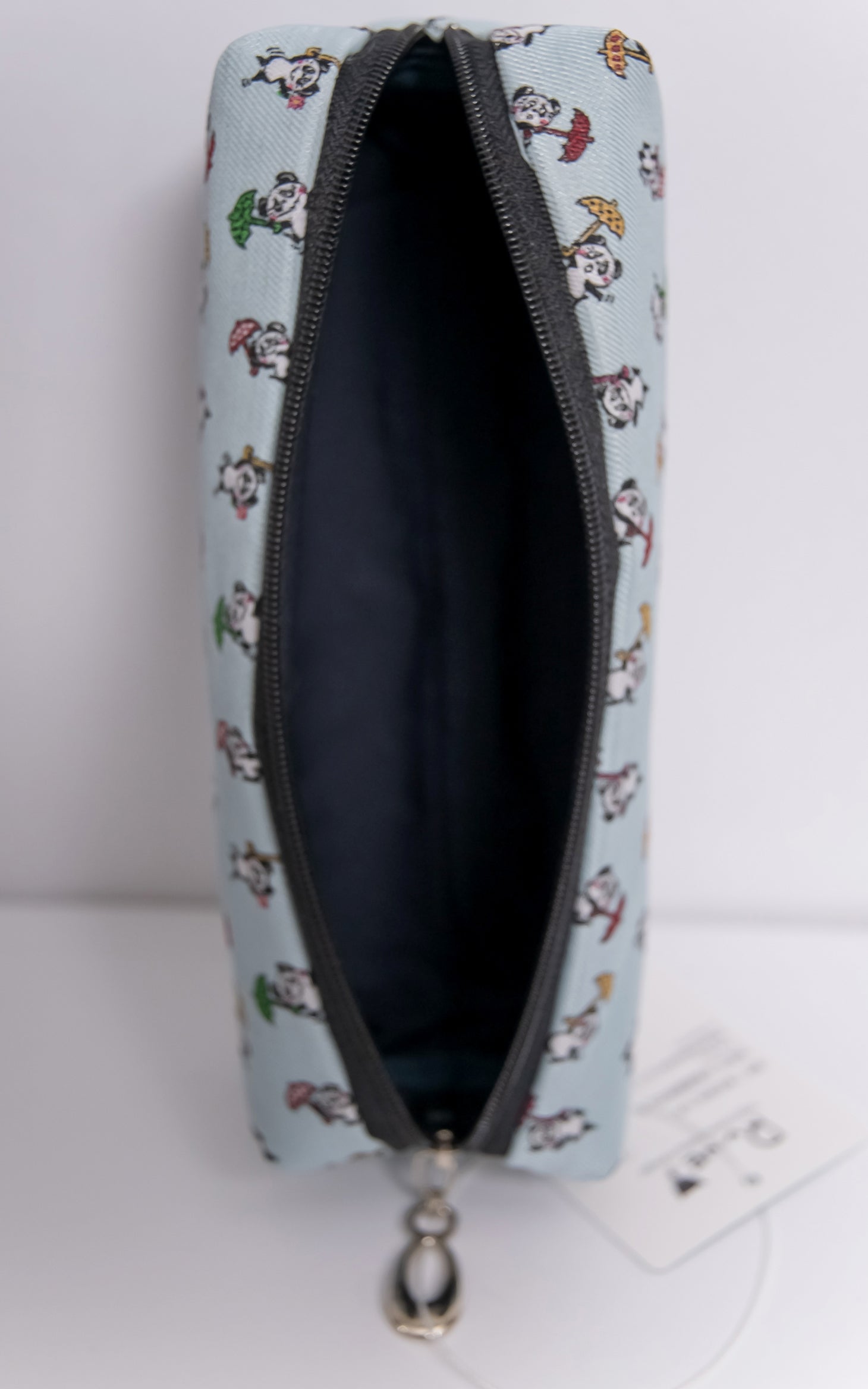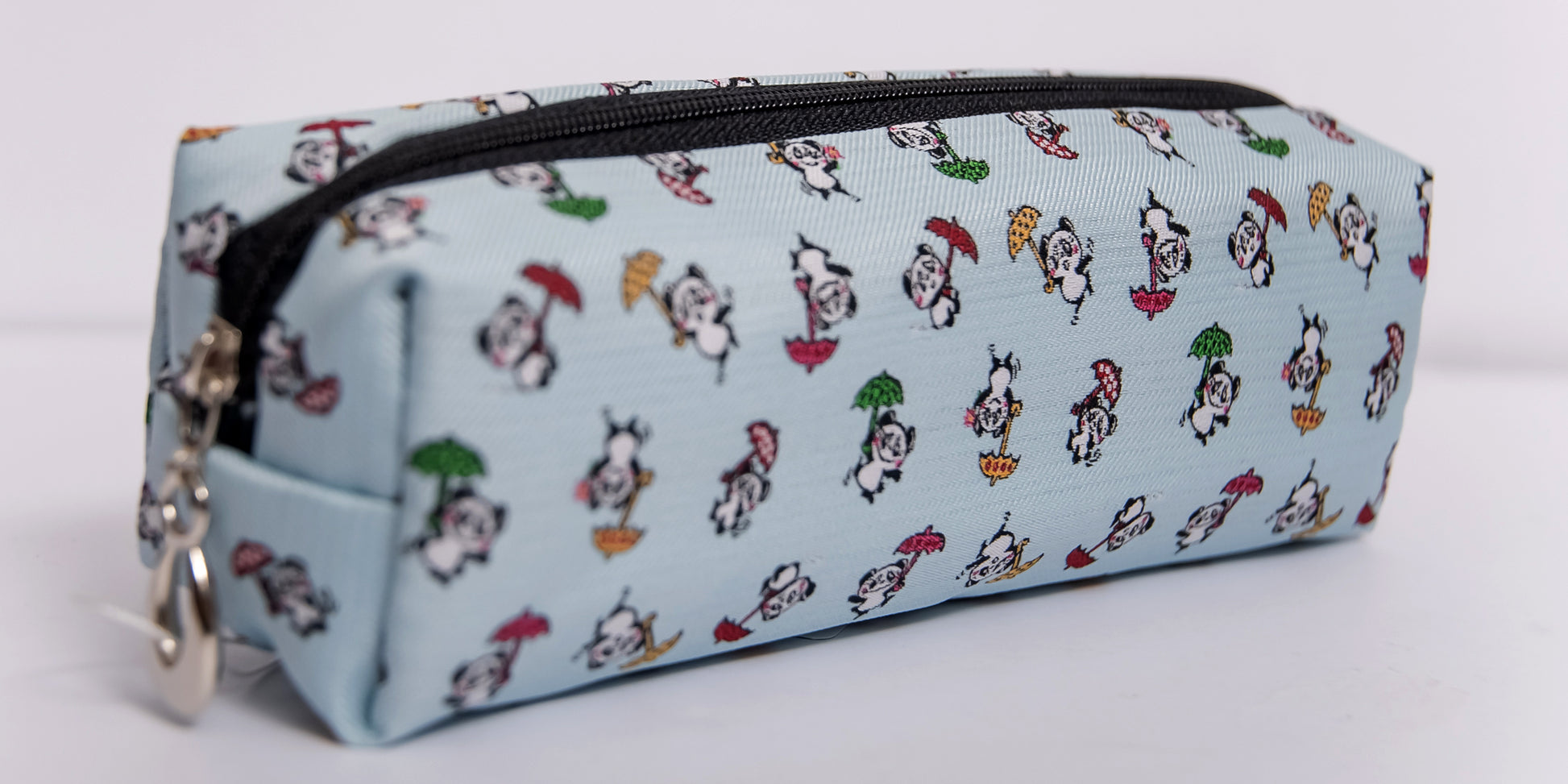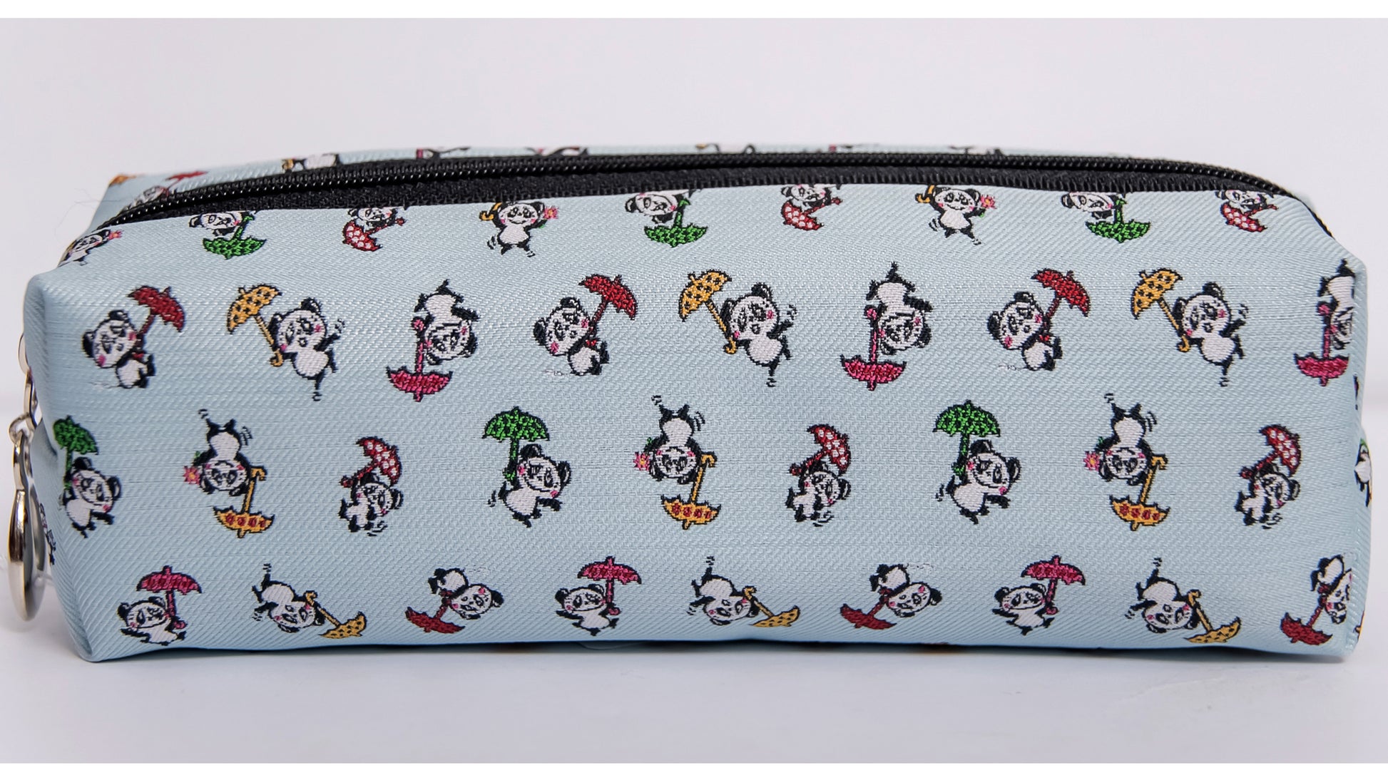 キャラクターのデザインをネクタイ織機を使用したジャカード生地で表現し、ペンケースに仕上げています。