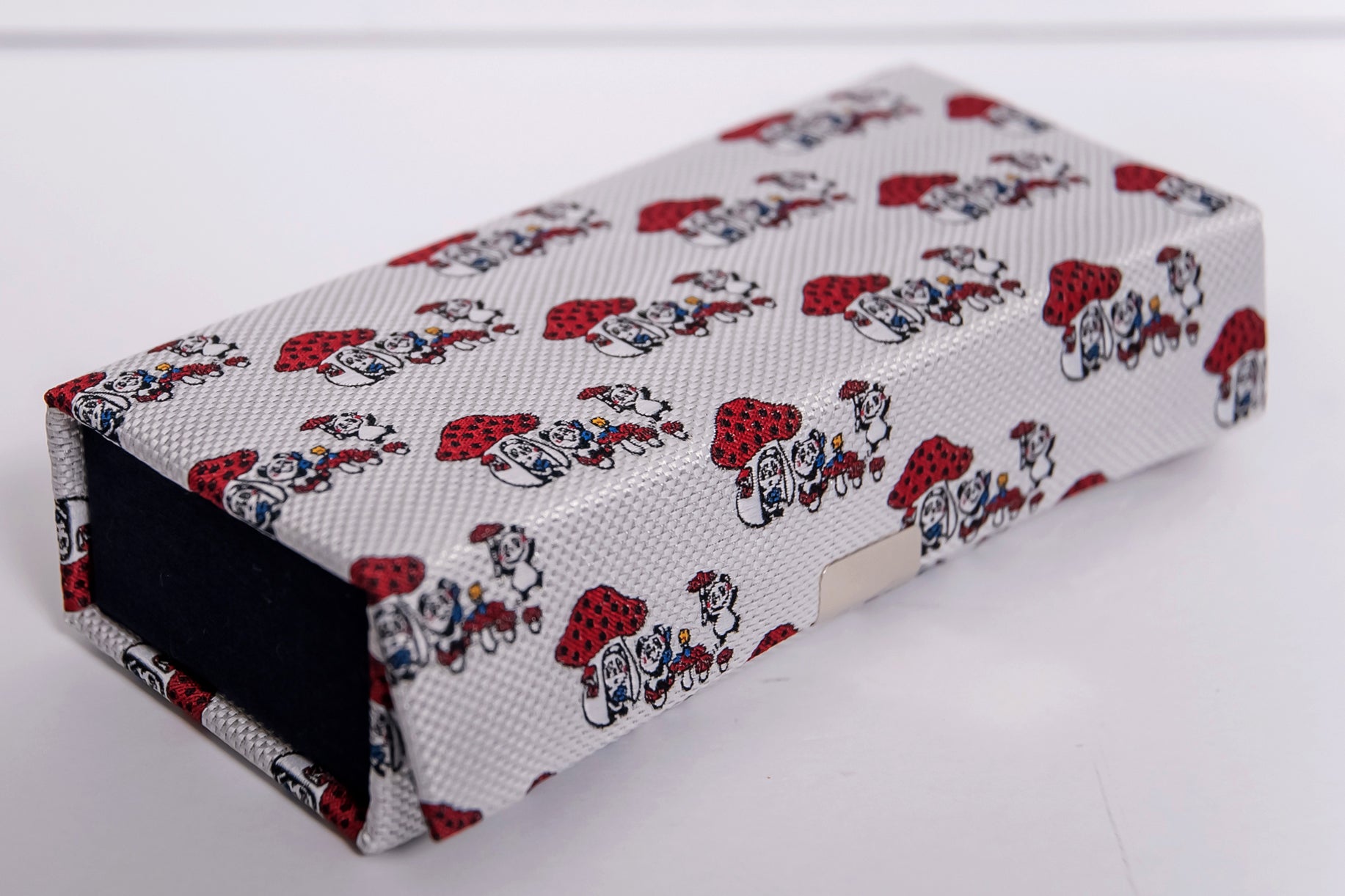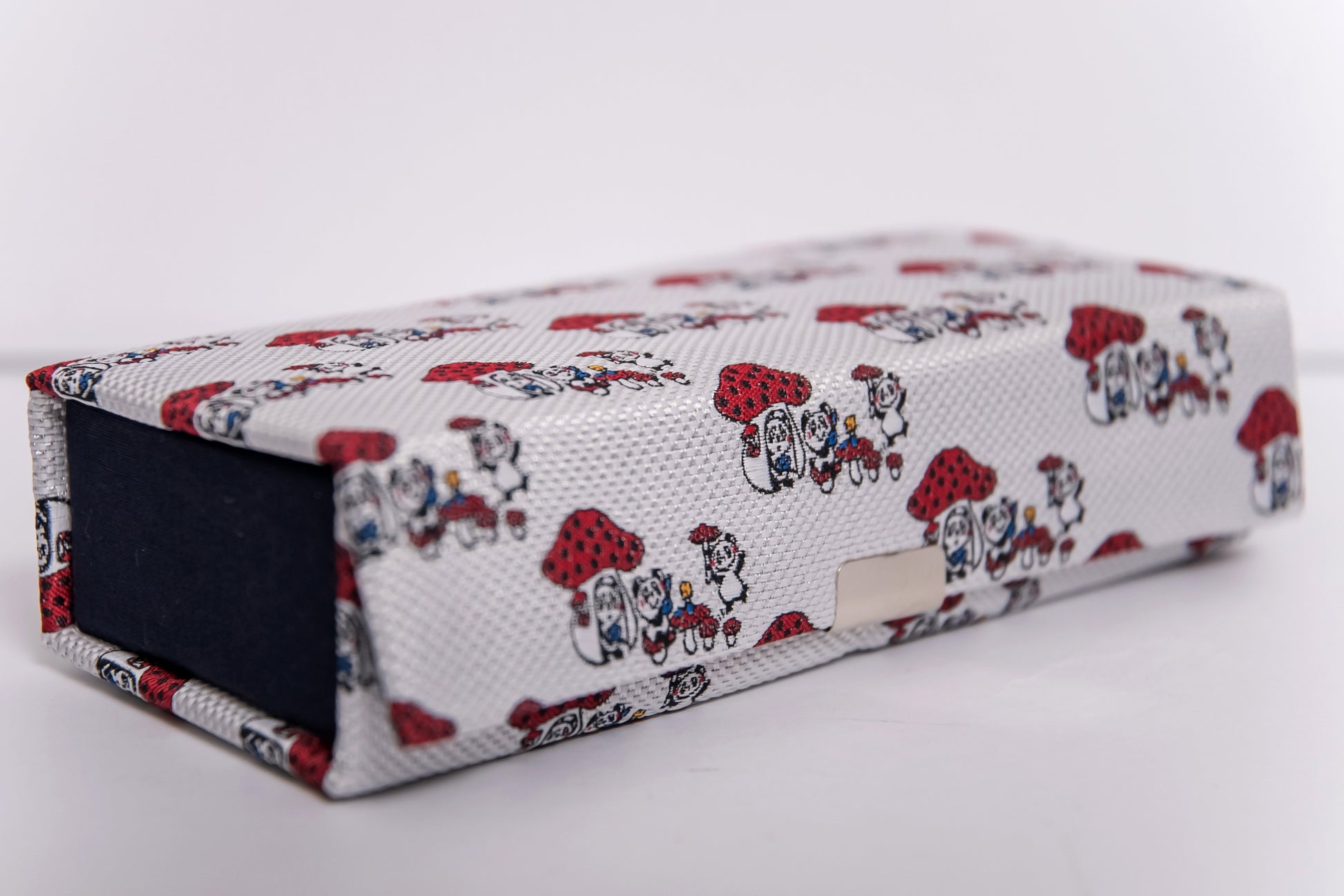 キャラクターのデザインをネクタイ織機を使用したジャカード生地で表現し、ペンケースに仕上げています。